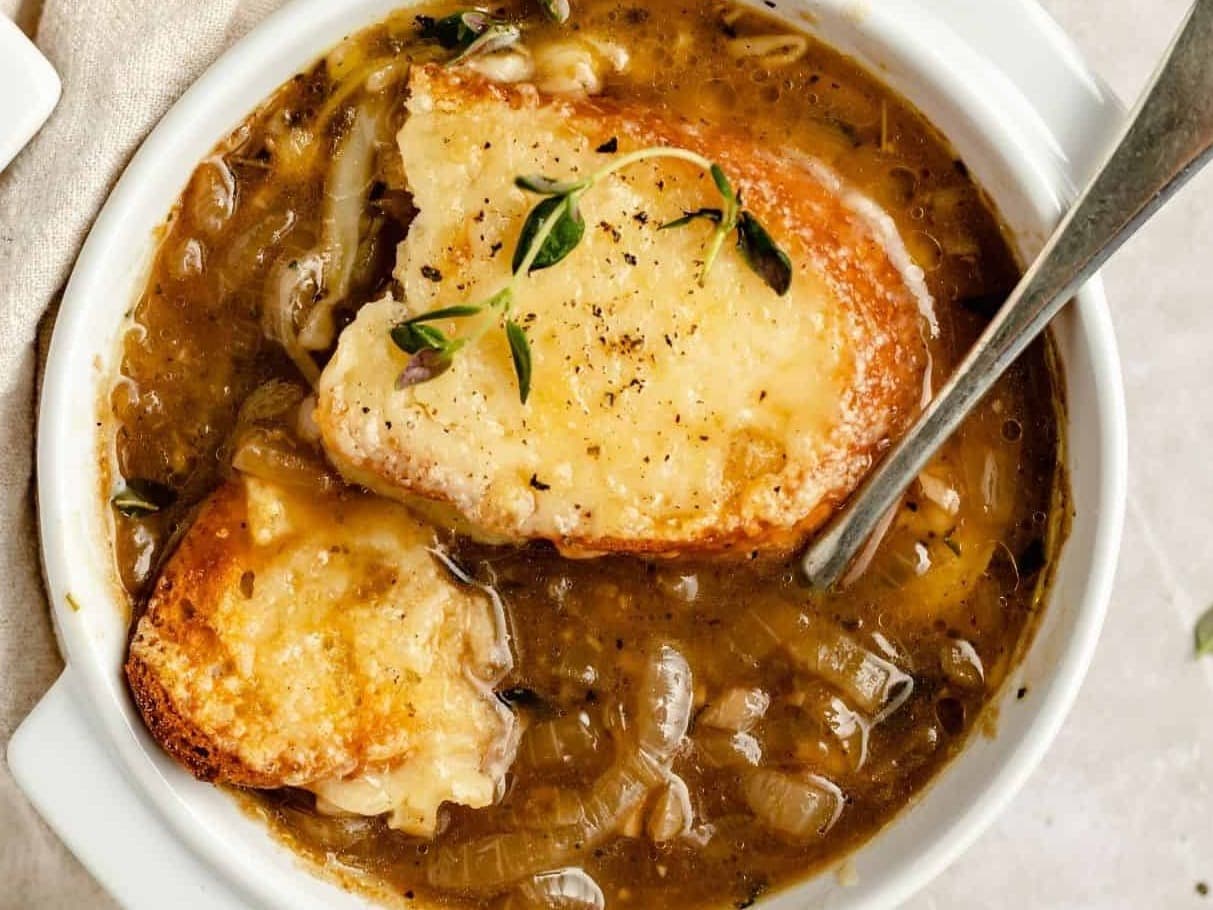 That old classic...sliced onions, slowly caramelised and cooked down to make a delicious light soup! Cheesy croutons served on the side.