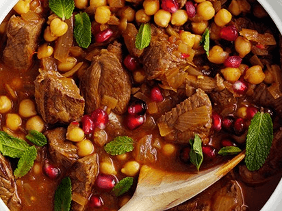 Overnight beef cooked in Persian flavours of pomegranate, cinnamon, honey and turmeric, saffron and fresh mint at the end.