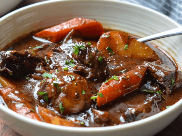 Something magical happens when you slow-cook beef in red wine – and it looks a little something like this recipe. Beef brisket is cooked low and slow for over five hours in the oven in this braised beef stew