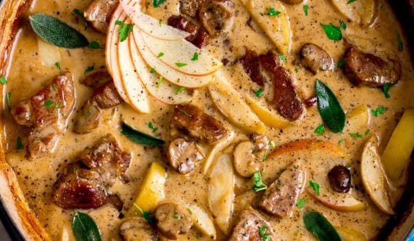 Slow cooked pork with cider, apples and cabbage and finished off with a splash of cream. A lovely and comforting casserole, great with mashed potatoes or a salad.