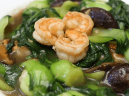 Japanese comfort food at its best - a bowl of healthy braised prawns, Asian greens and mushrooms in a sauce of sake, mirin, dashi and soy.