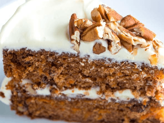A classic cake, delicious and moist, every cinnamon-kissed bite is nestled under a blanket of burnt butter cream cheese frosting and roasted pecans.
