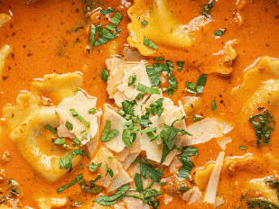 This home made creamy tomato soup is even more delicious with cheesy ravioli!