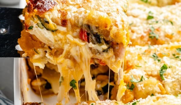 Classic pasta with layers of seasonal vegetable ragu and creamy spinach bechamel - ready for you to pop in the oven and bake!