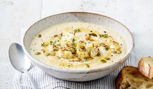 A match made in heaven - roast cauliflower, roast garlic, creamy cheddar cheese and parmesan are the perfect partners in this elegant soup!