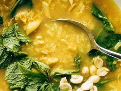 Healing Chicken and Rice Soup that is limey, salty, and so fresh! Garlic-ginger-infused broth, shredded chicken, miso, tender rice, fresh herbs, and peanuts. YUM.