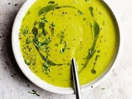 It's the incredible hulk soup! Zucchini, broccoli, spinach and leek make a light, nutritious soup, topped with feta cheese and toasted seeds.