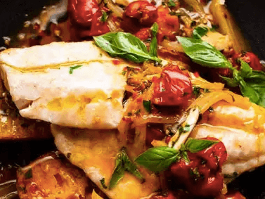 Flaky, oven-roasted barramundi served in a fragrant bed of caramelised fennel and sweet roasted cherry tomatoes, finished with fresh basil for a bright, herbaceous lift.
