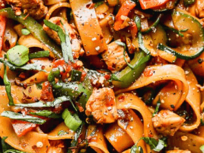 This Drunken Noodles recipe (Pad Kee Mao) is a flavour-packed Thai dish with stir-fried rice noodles, tender chicken, crisp vegetables, and aromatic Thai basil in a bold, spicy sauce.
