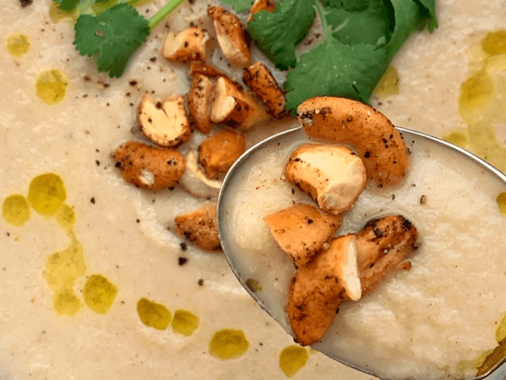 Say hello to perfect roasted cauliflower soup with plenty of garlic, nutmeg, and white beans. Buttery cashews help create the ultimate velvety texture. Complex, Creamy, Nutty, Rich & oh so comforting!