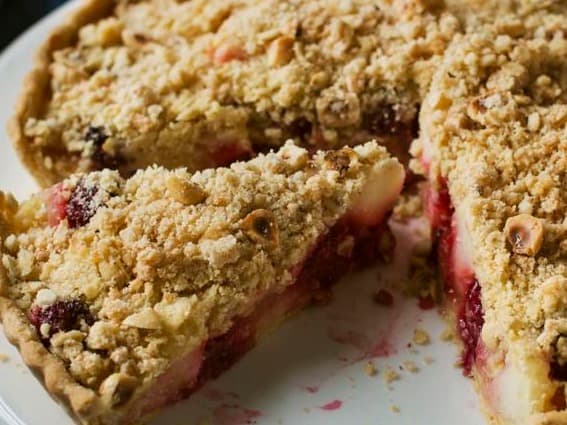 The delicious dessert is the perfect combination of tart and crumble filled to the brim with juicy apples and blackberries.
