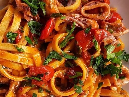 Slow cooking fennel in olive oil and butter brings out the sweetness in this dish, along with a cherry tomato sauce and a dash of white wine, if you love calamari and you love a bowl of pasta - this one's for you!