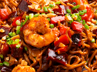 Spicy kung pao stir-fry flavours get jiggy with chewy, bouncy noodles. The result? A chilli-packed punch to the tastebuds, with lashings of pure joy.
