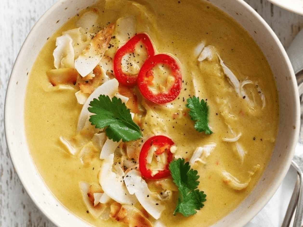 Putting a spin on an old favourite soup with mild Thai spices and crunchy toasted coconut on top.