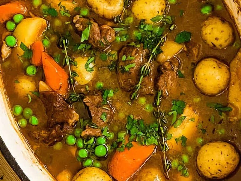 Tender chunks of slow-braised beef simmered in a rich, dark Guinness gravy with root vegetables and herbs. Deeply comforting, robust, and full of bold, malty flavour.