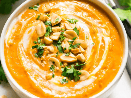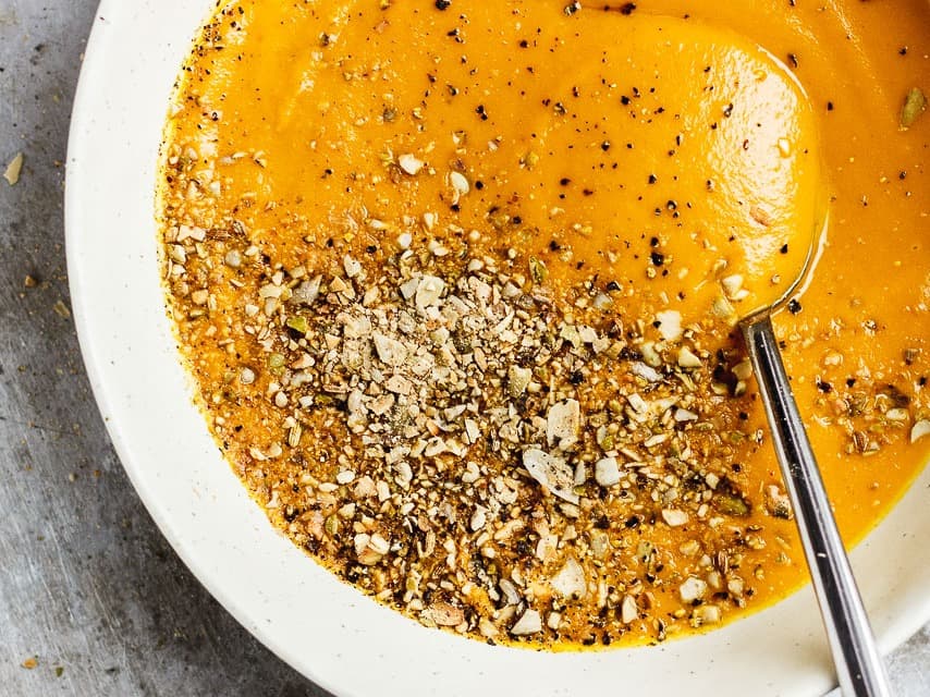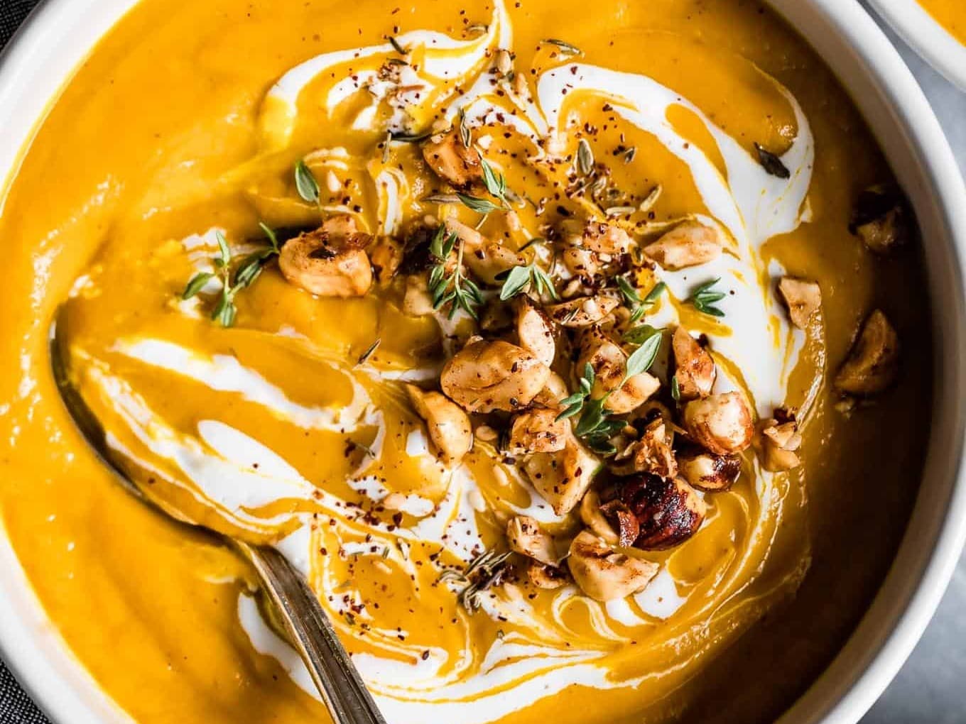 Creamy carrot soup with white beans seasoned with thyme, cumin and coriander and topped with cinnamon hazelnuts and a lemon yogurt swirl.