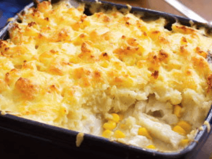 Local fish in a creamy white wine sauce with a mashed potato topping.