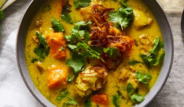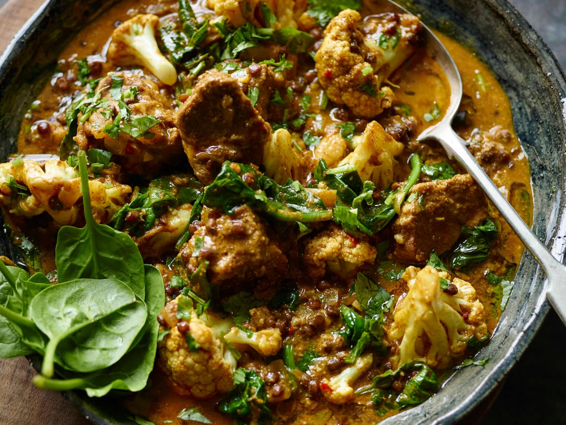 Rich and fragrant korma curry cooked overnight with tender lamb, mild spices, cauliflower, coconut and spinach.