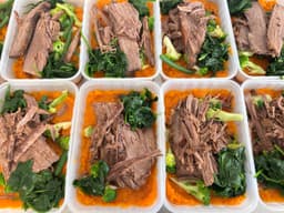 Choosing our Gainz meals which are made up of; 250 of Sweet Potato Mashed 80g of Steam Vegetables 200g of Cooked Beef Topside Total Calories: 630 Carbs: 49g Protein: 67g Fat:16g Oregano, garlic and mixed herb