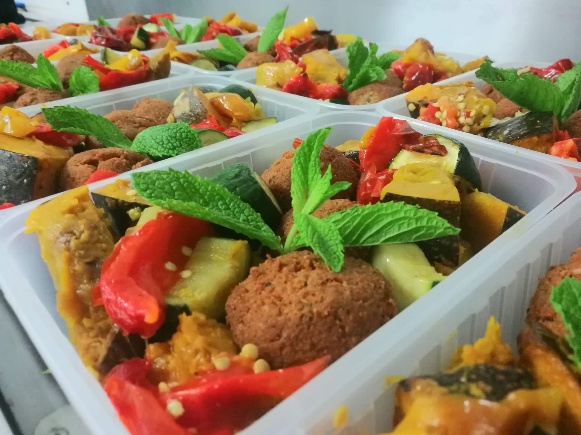 Spiced, mashed chickpeas formed into balls and baked forming a golden crust, served with a medley of roasted vegetables.