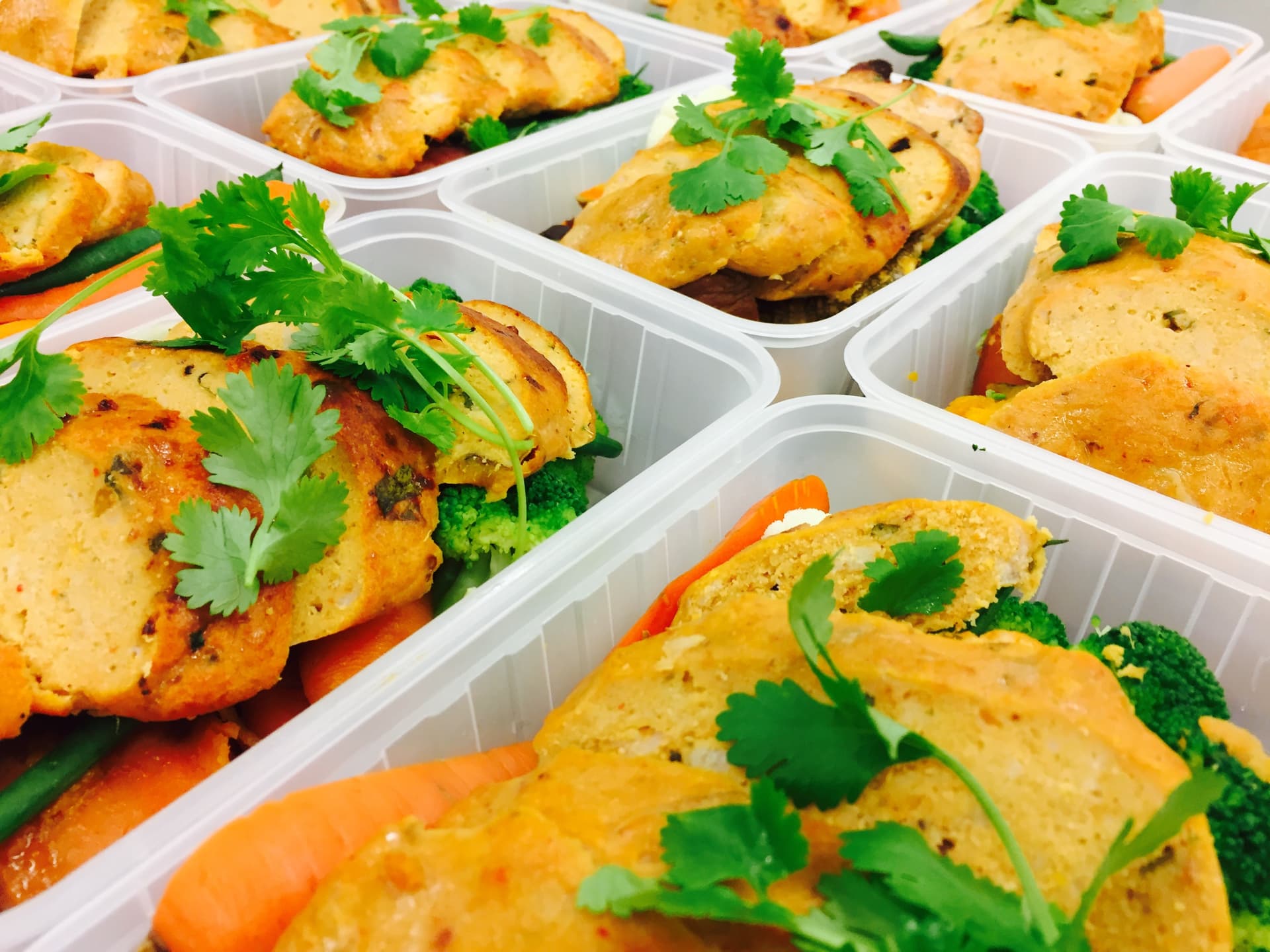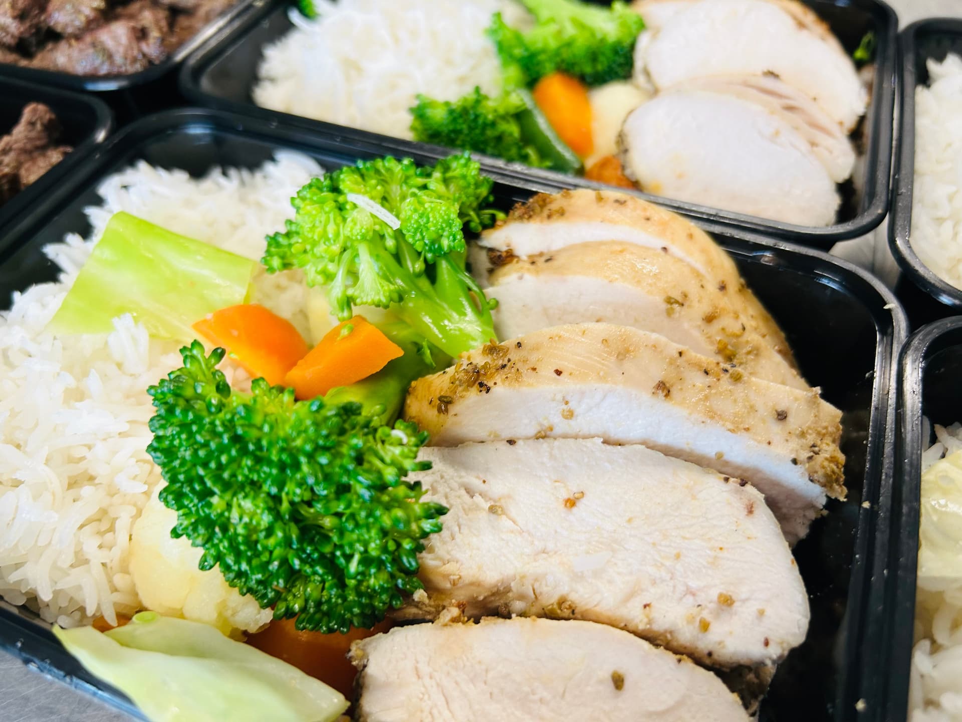 Choosing our Lean meals are made up of: 100g of Jasmine Rice 100g of Steamed Vegetables 100g of Cooked Chicken Breast No added oil using mixed herb rub for the chicken. Total Calories: 309 Carbs: 30g Protein: 35g Fats: 4g