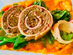 Grass Fed Meatloaf wrapped in bacon and comes with mashed pumpkin & Greens.