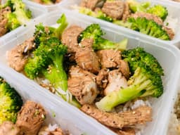Beef Rump, Rice, Broccoli, Soy Sauce (Gluten Free), Garlic, Shallots, Green Beans, Ginger, Himalayan Salt, Black pepper, Sesame Seeds, Chinese Cooking Wine - Gfree, Sesame Oil