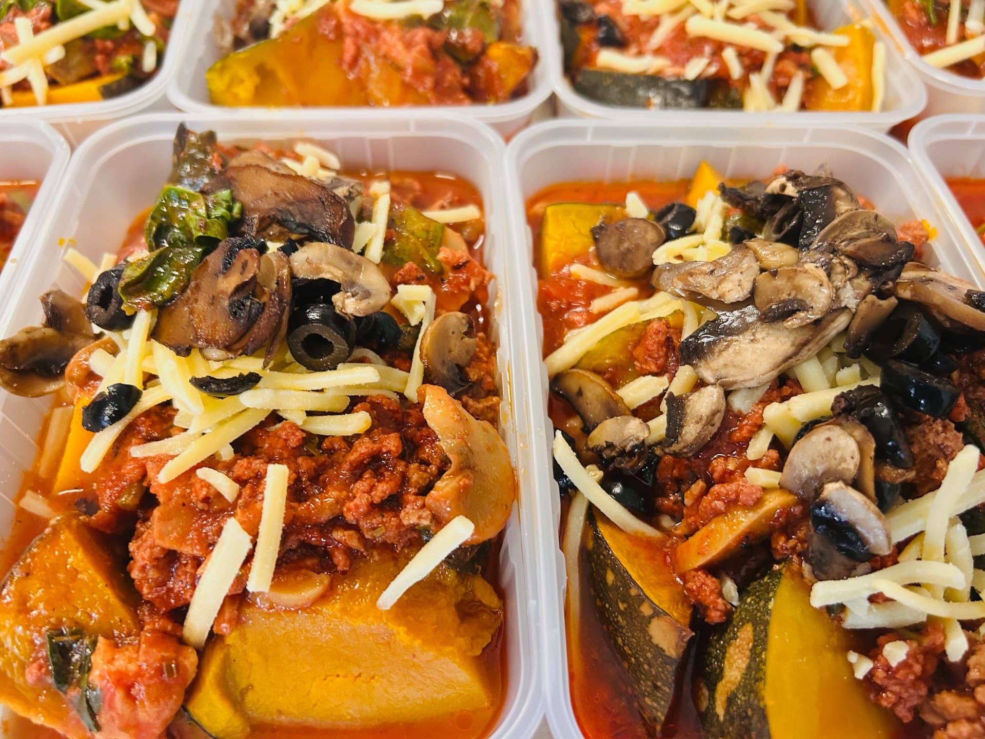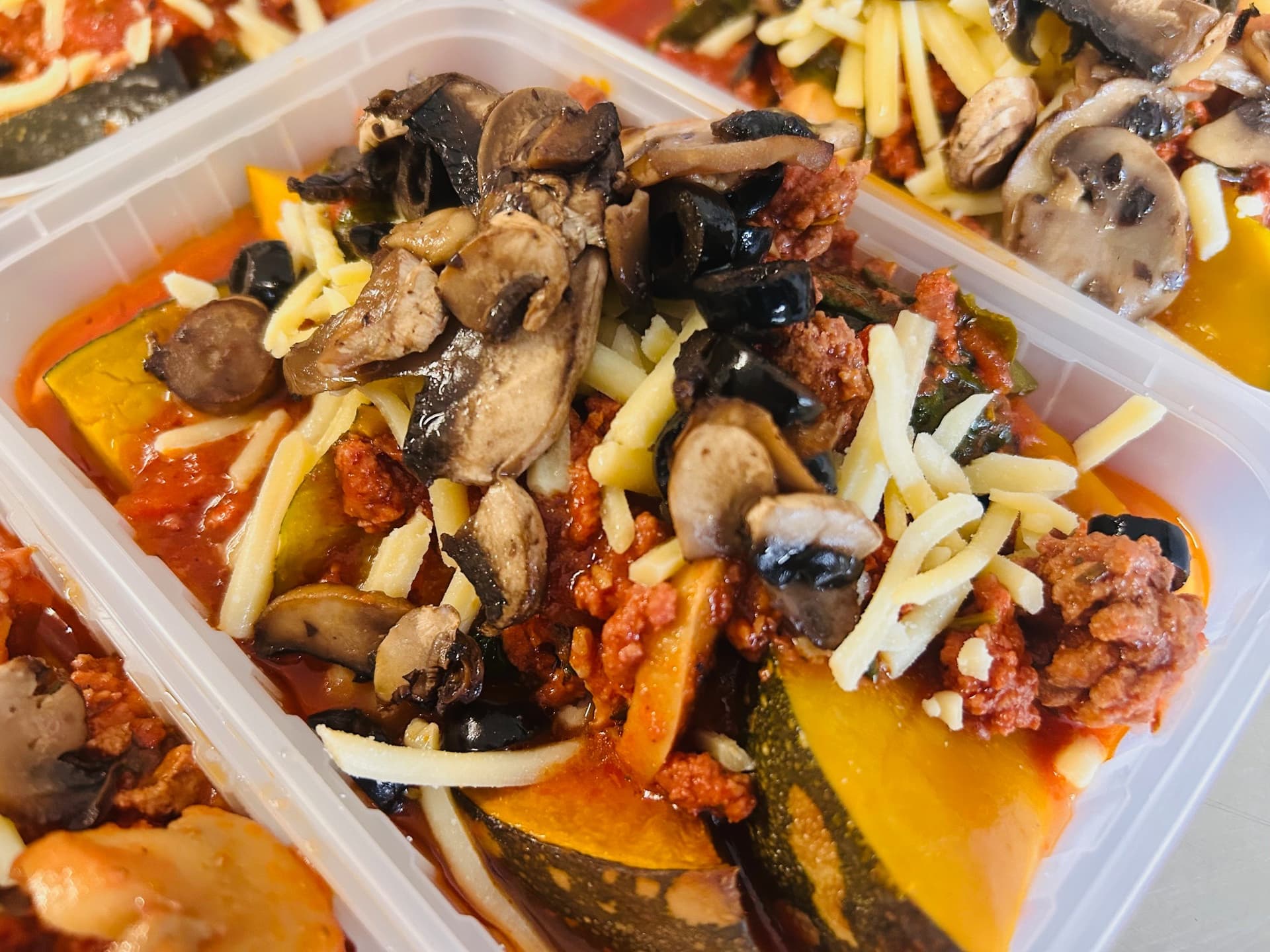 The Eat Real version of this supreme mix of flavours. Tomato base sauce with beef mince, bacon mixed with some champignons, spinach, black olives and a sprinkle of shredded cheese served over roast pumpkin.