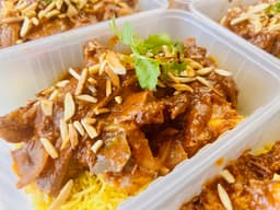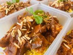 Lamb leg roast, Rice, Tomato Paste, Maple Syrup, Lemon, Ginger, Dates, Cinnamon, Turmeric, Fennel, Cardamon, Himalayan Salt, Coriander, Almonds, Black pepper, Nutmeg, Cayenne Pepper, Allspice, Cloves