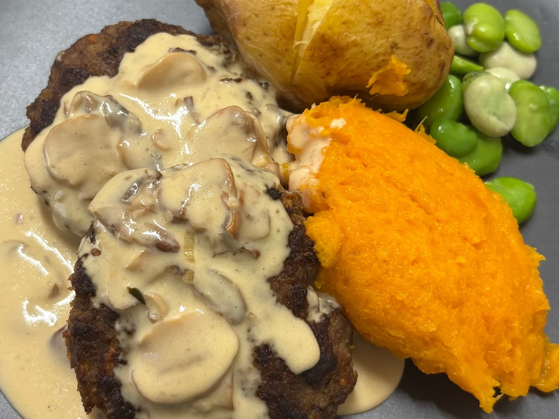 Old fashioned home style cooking has never been so good! Succulent beef rissoles, mushroom cream sauce, buttery pumpkin puree, broadbeans and baked potato. just yum!