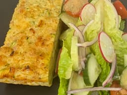 Bake the zucchini slice on a tray lined with baking paper at 180 C for 12 minutes. Serve with the salad