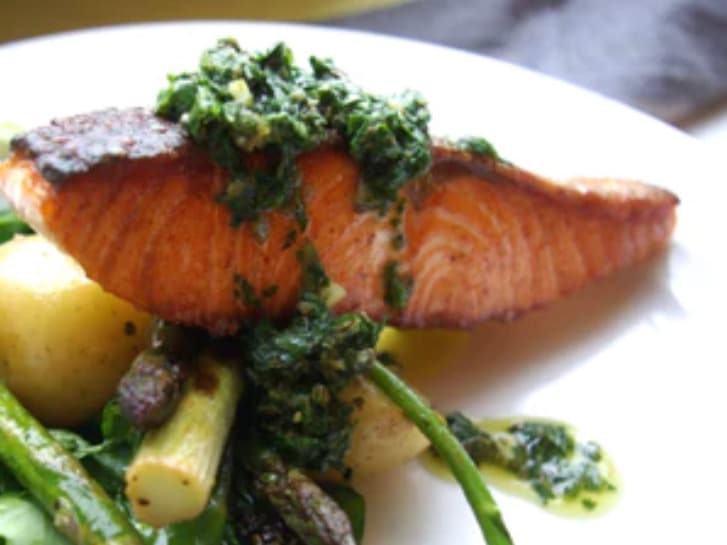 A 100gm fillet of salmon, served on top of our creamy potato puree with a generous dollop of salsa verde which is a herby lemon dressing. Accompanied by steamed green vegetables.