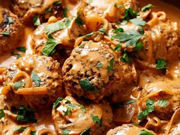 Tender strips of beef in a creamy mushroom sauce thats off set by a dash of mustard and some sour cream. What more can you ask for?!!