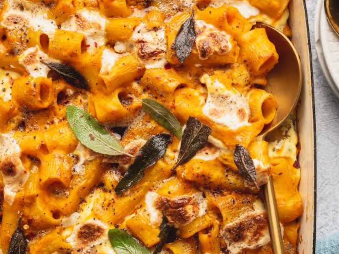Roasted pumpkin puree forms the base of this tasty pasta bake. It is topped with a dollop of mascarpone cheese and crispy fried sage leaves. simply bake in the oven to reheat it or transfer it to a microwave safe dish and microwave gently to reheat.