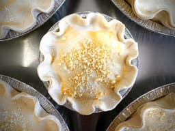 Remove the plastic and place the pie in the preheated oven @ 200C . Bake for approximately 20-30 minutes or until the pastry is golden and cooked underneath.