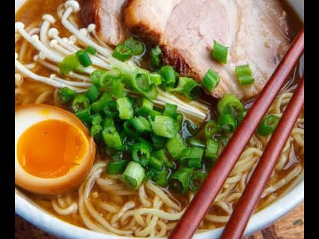 This is a restorative Japanese miso broth with pork shoulder, ramen noodles and marinated eggs. It also has ginger, nori, spring onion and spinach to complete the umami of this popular asian soup noodle dish.