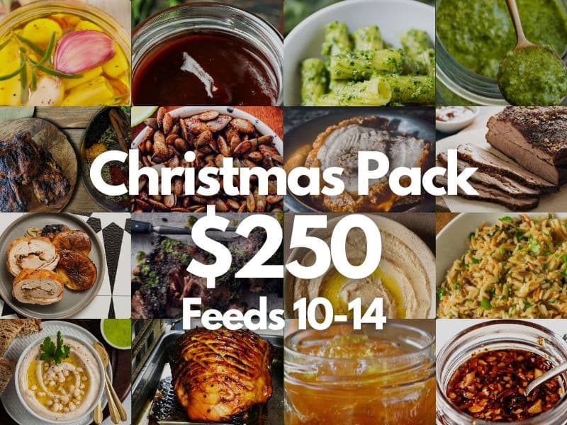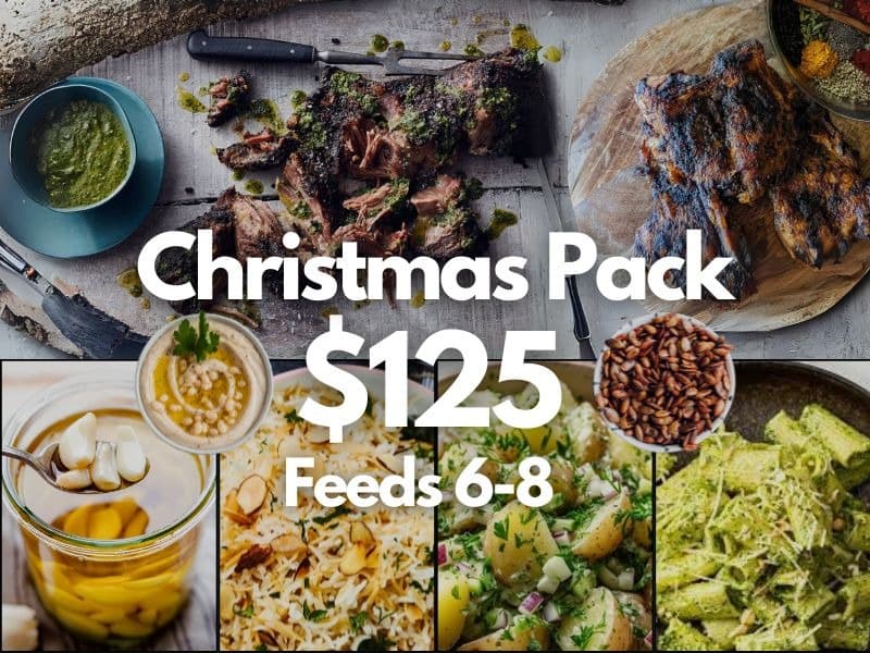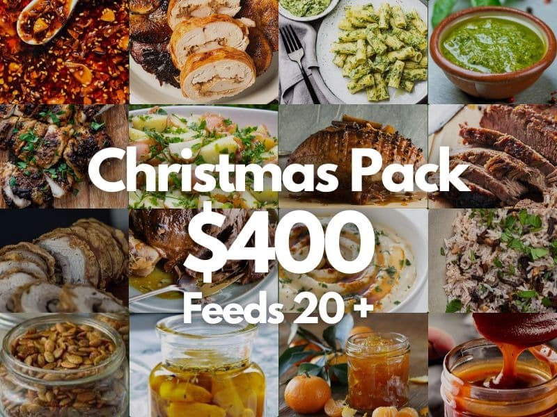 Feeds 10-14. Celebrating fine Victorian seasonal produce curated into an impressive feast. This year, there's more meat options and an incredible range of seasonal condiments. Hassle-free dining! Simply follow the included salad assembly instructions, reheat your mains, plate your sides and you're ready to eat! More to feed? Explore our 1kg Sauce Packs and delectable desserts!
