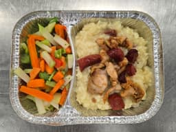 NOTE: LIMITED QUANTITY AVAILABLE Chicken and chorizo risotto served with panache vegetable mix (broccoli, carrot, red capsicum, sugar snap peas, baby corn).