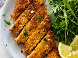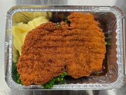 Chicken schnitzel served with mash potatoes, gravy & steamed vegetables.