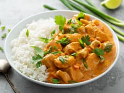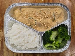 Tender chicken in satay sauce served with rice and broccoli