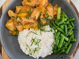 Apricot chicken served with rice and green beans