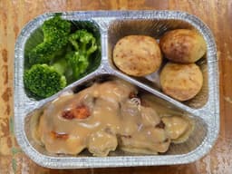 Roast Chicken with Bones [Mineral salt (451, 452, 450), Salt, Maltodexterin, Yeast extract, Vegetable powder, Onion, Garlic, Thickener (415), Acidity regulator (262), Herb extracts, Natural Colour (160c), Smoke flavour], Baby potatoes, Water, Broccoli, Chicken Gravy [Rice flour, Maltodexterin, Modified Starch (1422), Iodised salt, Yeast extract, Chicken powder, Sugar, Beef fat, Flavour, Onion powder, Vegetable gum (412), Vegetable Gum (415), Colour (150c), Spices, Flavour enhancer (635), Herbs]