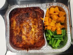 Your meal is supplied in a container designed for heating in a conventional oven and microwave. Meals must be heated to a minimum internal temperature above 70°C. Do not remove lid. Reheating times are approximate: From frozen thaw on defrost setting for 5 mins. Once defrosted heat on high for 4-5 mins or until hot.