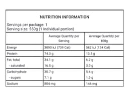 Your meal is supplied in a container designed for heating in a conventional oven and microwave. Meals must be heated to a minimum internal temperature above 70°C. Do not remove lid. Reheating times are approximate: From frozen thaw on defrost setting for 5 mins. Once defrosted heat on high for 4-5 mins or until hot.
