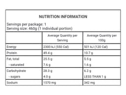 Your meal is supplied in a container designed for heating in a conventional oven and microwave. Meals must be heated to a minimum internal temperature above 70°C. Do not remove lid. Reheating times are approximate: From frozen thaw on defrost setting for 5 mins. Once defrosted heat on high for 4-5 mins or until hot.