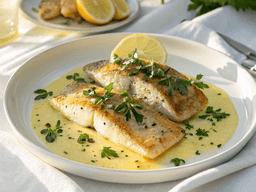 White fish in lemon butter sauce served with chat potatoes and sauteed greens