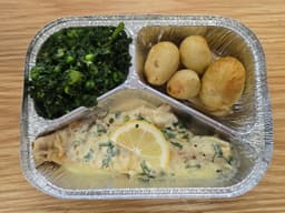 Baby potatoes, White Fish, Asparagus, Peas, Green beans, Creamy Lemon Butter Sauce [Cooking cream (Milk), White wine, Butter (Milk), Lemon juice, Garlic, Pepper, Salt], Baby Spinach, Butter (Milk), Wheat flour, Pepper, Salt, Garlic Paste [Garlic, Salt, Food acid (270)], Olive oil, Parsley