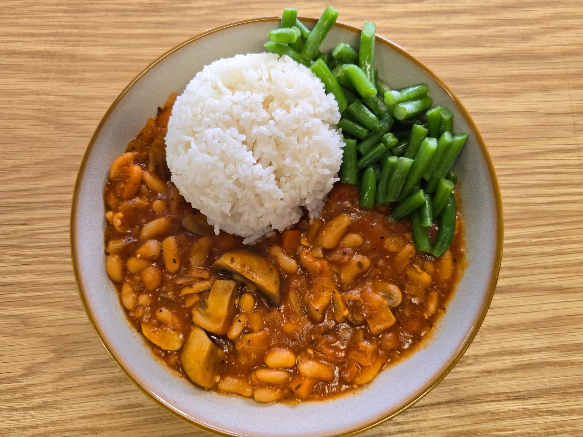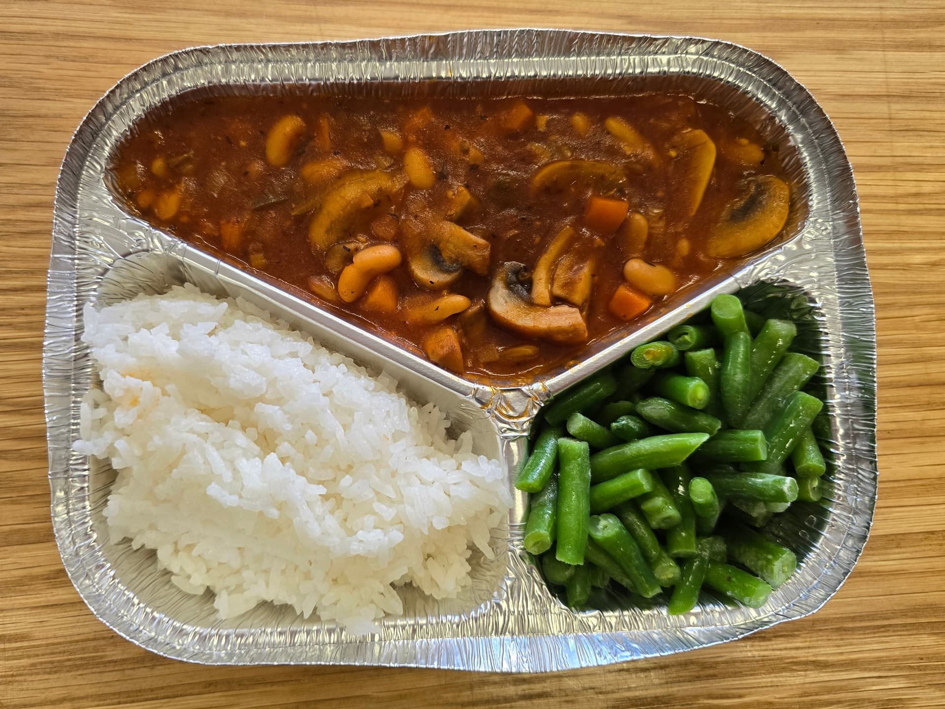 Vegetarian lasagne served with pumpkin cubes & green beans.