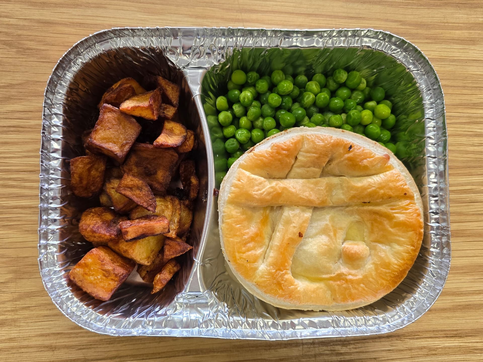 Slow-cooked beef in gravy served with roasted chat potatoes, peas & carrots