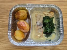 Baby potatoes, White Fish, Asparagus, Peas, Green beans, Creamy Lemon Butter Sauce [Cooking cream (Milk), White wine, Butter (Milk), Lemon juice, Garlic, Pepper, Salt], Baby Spinach, Butter (Milk), Wheat flour, Pepper, Salt, Garlic Paste [Garlic, Salt, Food acid (270)], Olive oil, Parsley, Canola oil spray (Soy)